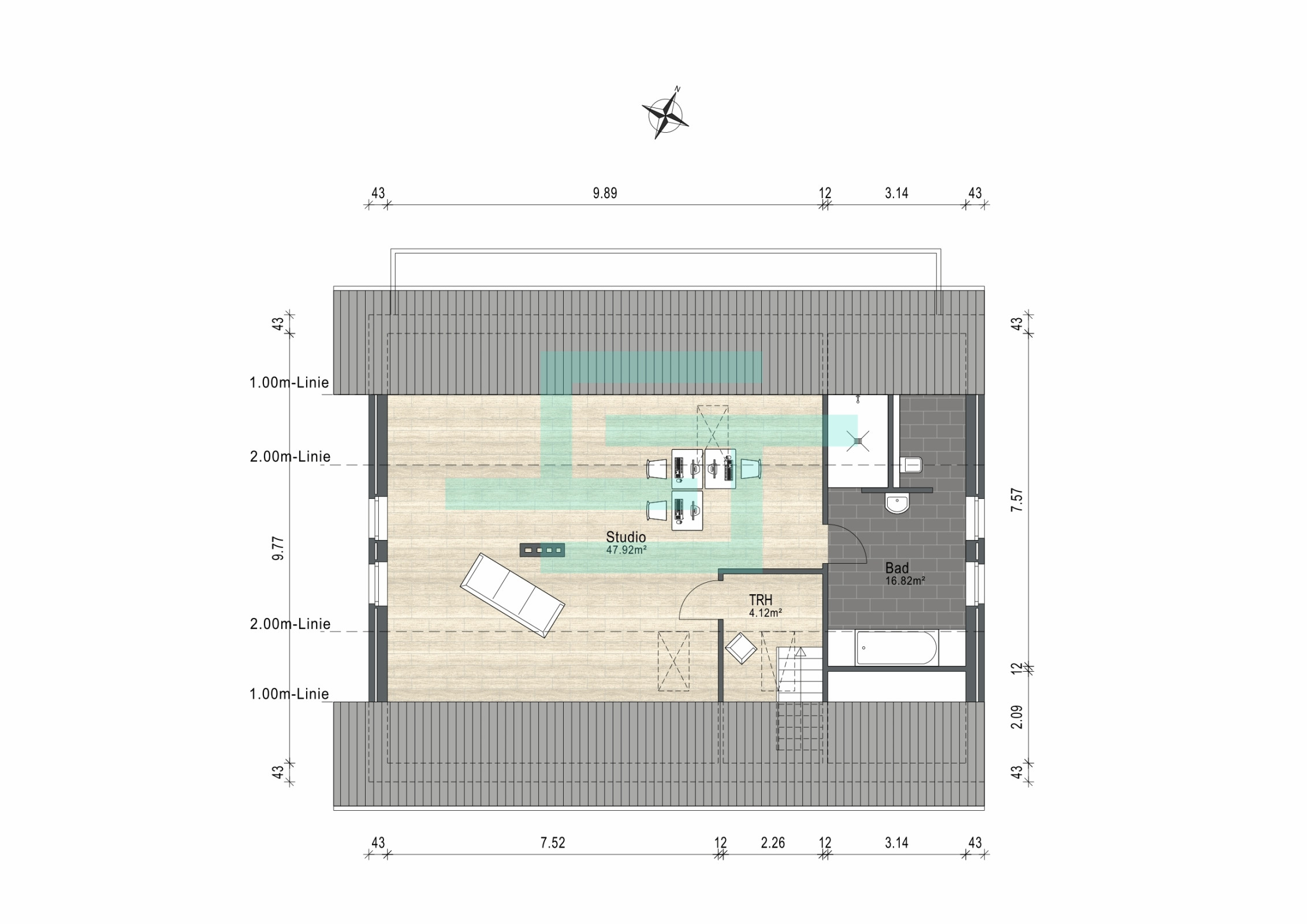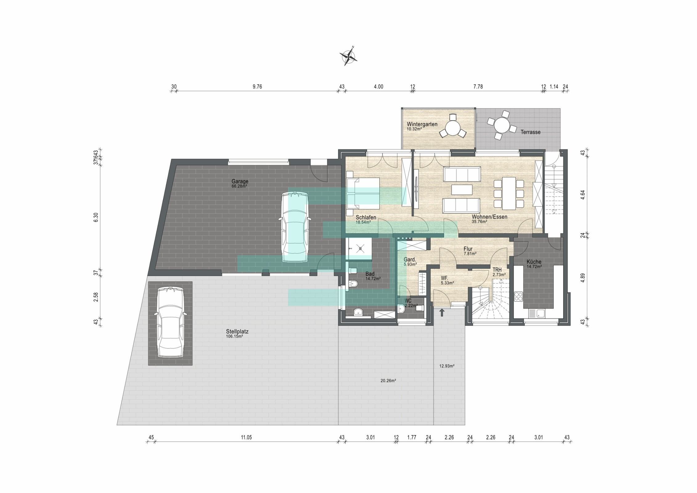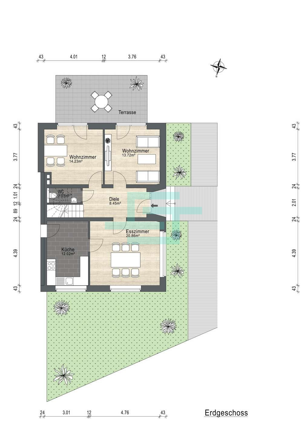 Der Eingangsbereich im Erdgeschoss empfängt Sie mit einem separaten Gäste-WC. Von hier aus gelangen Sie direkt in den großzügigen Wohnbereich mit offener Gestaltung. Links befindet sich die Küche, während der Wohn- und Essbereich durch eine große Fensterfront mit Schiebetüren geprägt ist, die einen direkten Zugang zur Terrasse und in den Garten ermöglicht.