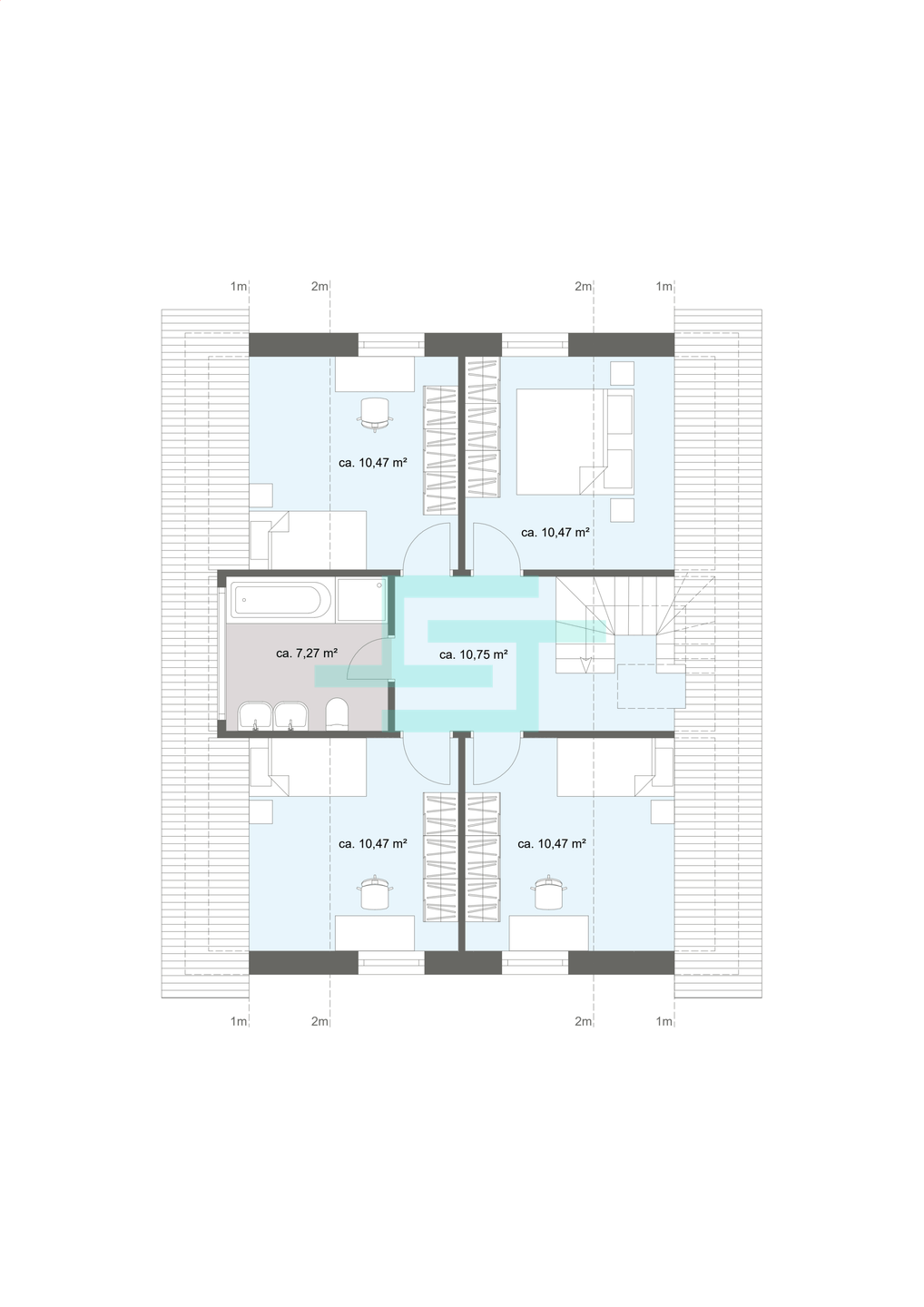 Die oberen Etagen sind in mehrere Zimmer mit jeweils zugeordneten Badezimmern gegliedert. Die Ausstattung der Bäder stammt überwiegend aus den 1970er- und 1980er-Jahren und ist modernisierungsbedürftig. Auch das Dachgeschoss verfügt über genehmigte Flächen sowie zusätzliche ausgebaute Bereiche, die weitere Nutzungsmöglichkeiten eröffnen.